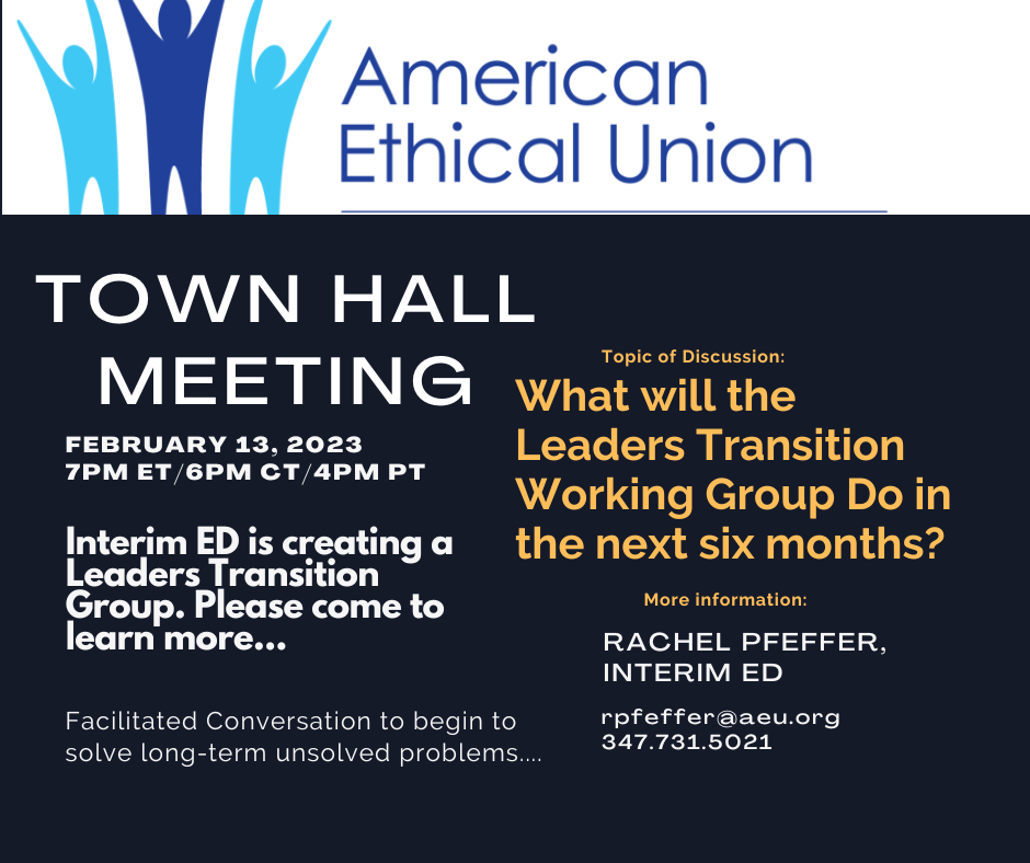 Interim Executive Director Rachel Pfeffer is hosting a AEU Town Hall to solve complex problems with the Ethical community. The purpose of the Town Hall is curb anxiety and practice transparency. I will explain why, who, when, where and what we plan to accomplish in the next six months.